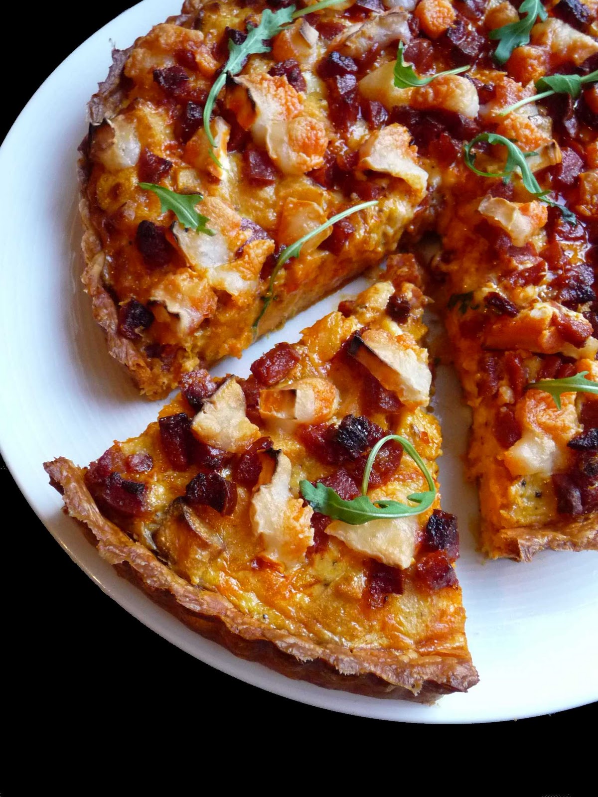 Sweet potato, squash, chorizo and goats' cheese tart